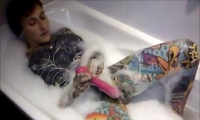 T-girl in fishnet bodystocking plays with a pink vibrator